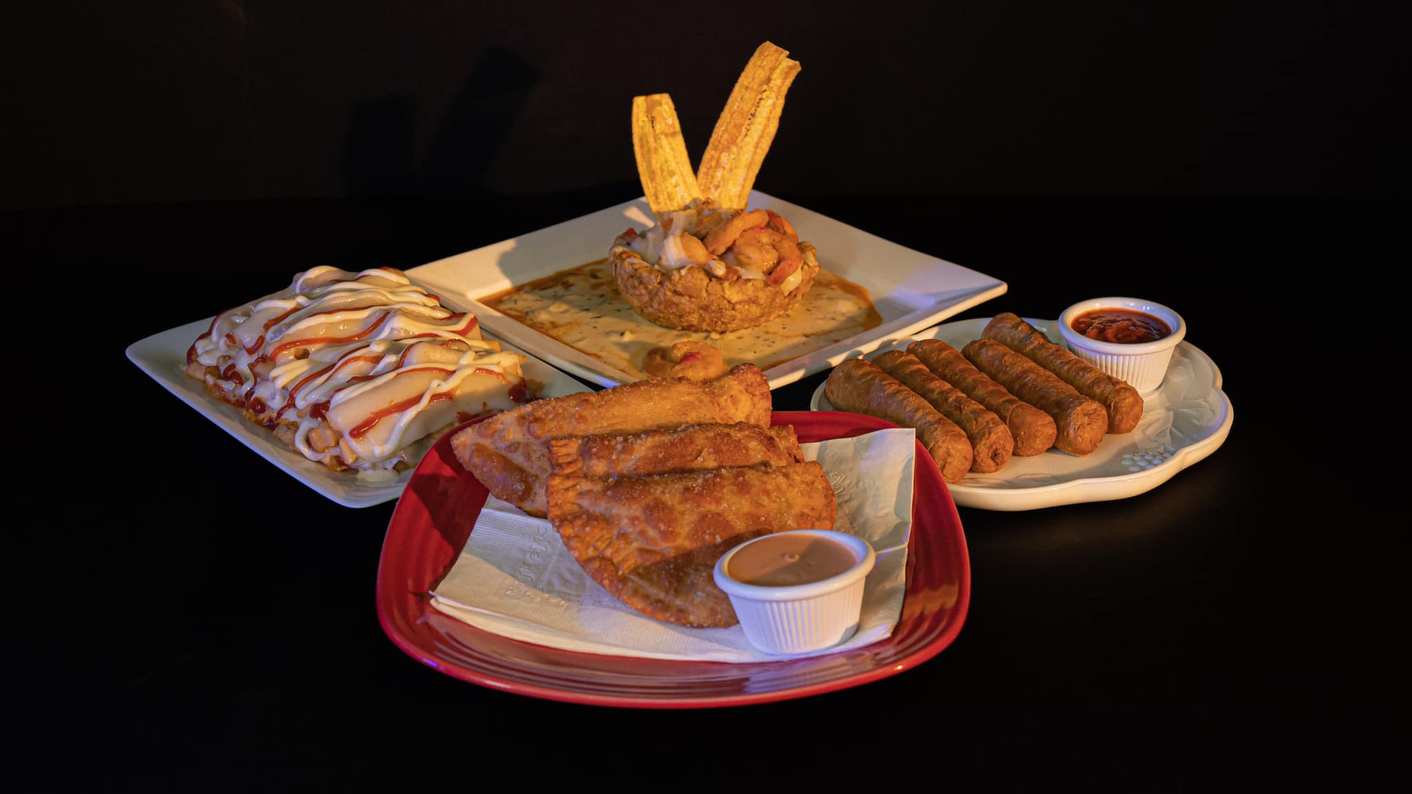 Popular items include 3+4 Combo Fried Food To Share, Cheeseburger, Chicharrón-Style Fried Chicken, Empanadas, and Vanilla Flan.